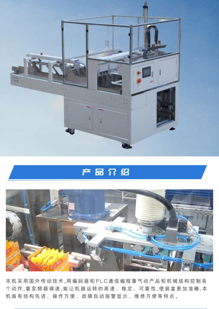 介紹:本機(jī)采用國(guó)外傳動(dòng)技術(shù),用編碼器和PLC通信編程靠氣動(dòng)產(chǎn)品和機(jī)械結(jié)構(gòu)控制各 個(gè)動(dòng)作,靠變頻器調(diào)速,能讓機(jī)器運(yùn)轉(zhuǎn)的高速、穩(wěn)定、可靠。本設(shè)備可實(shí)現(xiàn)自動(dòng)下料,開(kāi)盒,關(guān)盒,黏膠等。 解決您的三大包裝難題實(shí)現(xiàn)自動(dòng)化生產(chǎn):1、大大降低企業(yè)的生產(chǎn)成本,單臺(tái)裝盒機(jī)八小時(shí)生產(chǎn)力約為3-5萬(wàn)盒,按此計(jì)算每臺(tái)裝盒機(jī)可省人工為10-15人;2、人工裝盒,易污染、易出差錯(cuò).車(chē)間多一人,更是多一個(gè)污染源.人工裝盒有時(shí)會(huì)漏裝說(shuō)明書(shū)或內(nèi)容物;3、提高企業(yè)生產(chǎn)力,從企業(yè)管理角度上來(lái)講,管理人難,管理設(shè)備易。 產(chǎn)品別稱(chēng):裝箱機(jī)、裝盒機(jī)、自動(dòng)裝箱機(jī)、自動(dòng)裝盒機(jī)、跌落式裝箱機(jī)、側(cè)推式裝箱機(jī)、抓舉式裝箱機(jī)、機(jī)器人裝箱機(jī)、一片式裹包機(jī)、條形全自動(dòng)裝盒機(jī)。